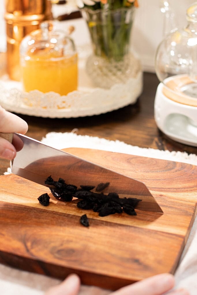 - Chop the dried cherries – Chop the dried cherries into small pieces roughly the size of a raisin so they infuse evenly into every scoop of the finished blend.