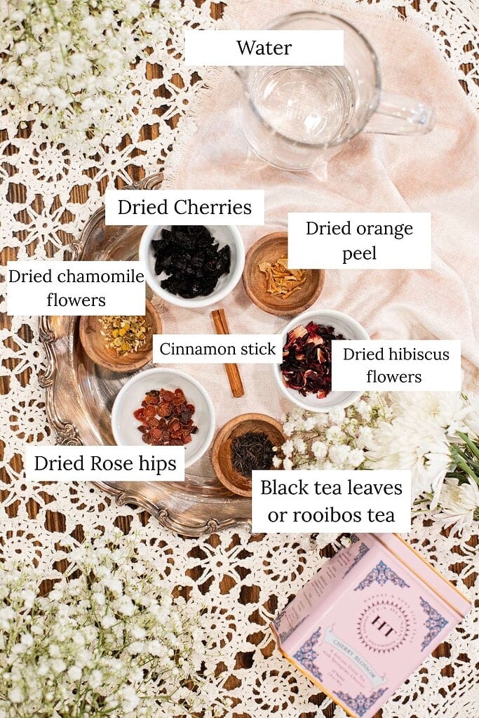 - Combine the dry ingredients. Add the chopped dried cherries, dried hibiscus flowers, rose hips, dried chamomile flowers, dried orange peel, broken cinnamon pieces, and black tea leaves or rooibos if using to a small bowl. Stir well until all ingredients are evenly distributed.
