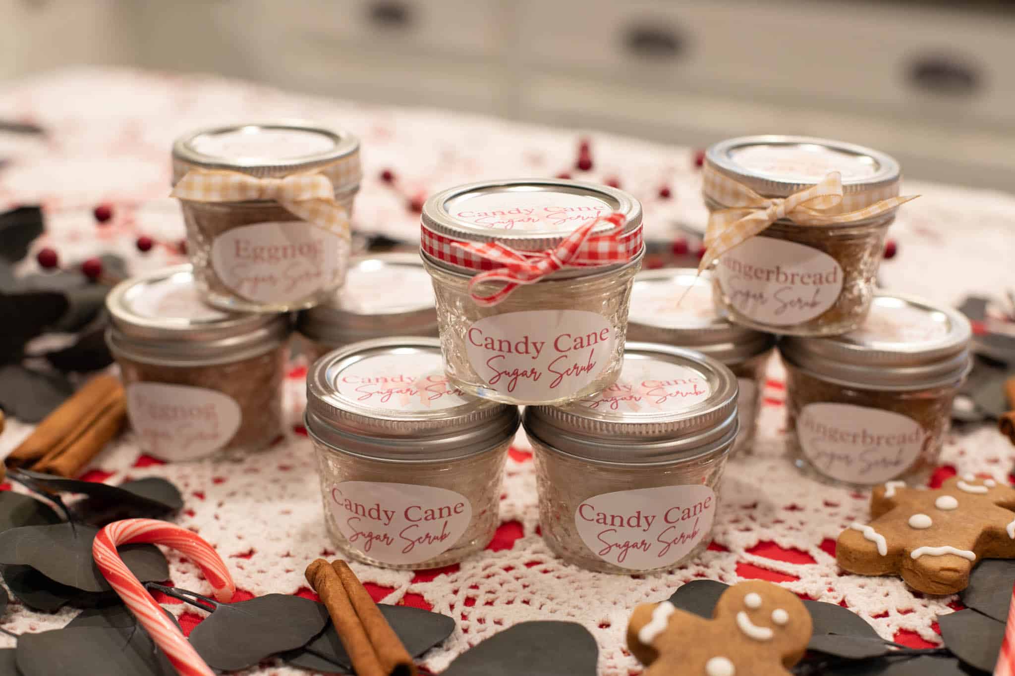 A closer angle of sugar scrub jars stacked and decorated for Christmas gifting, surrounded by cozy holiday accents.