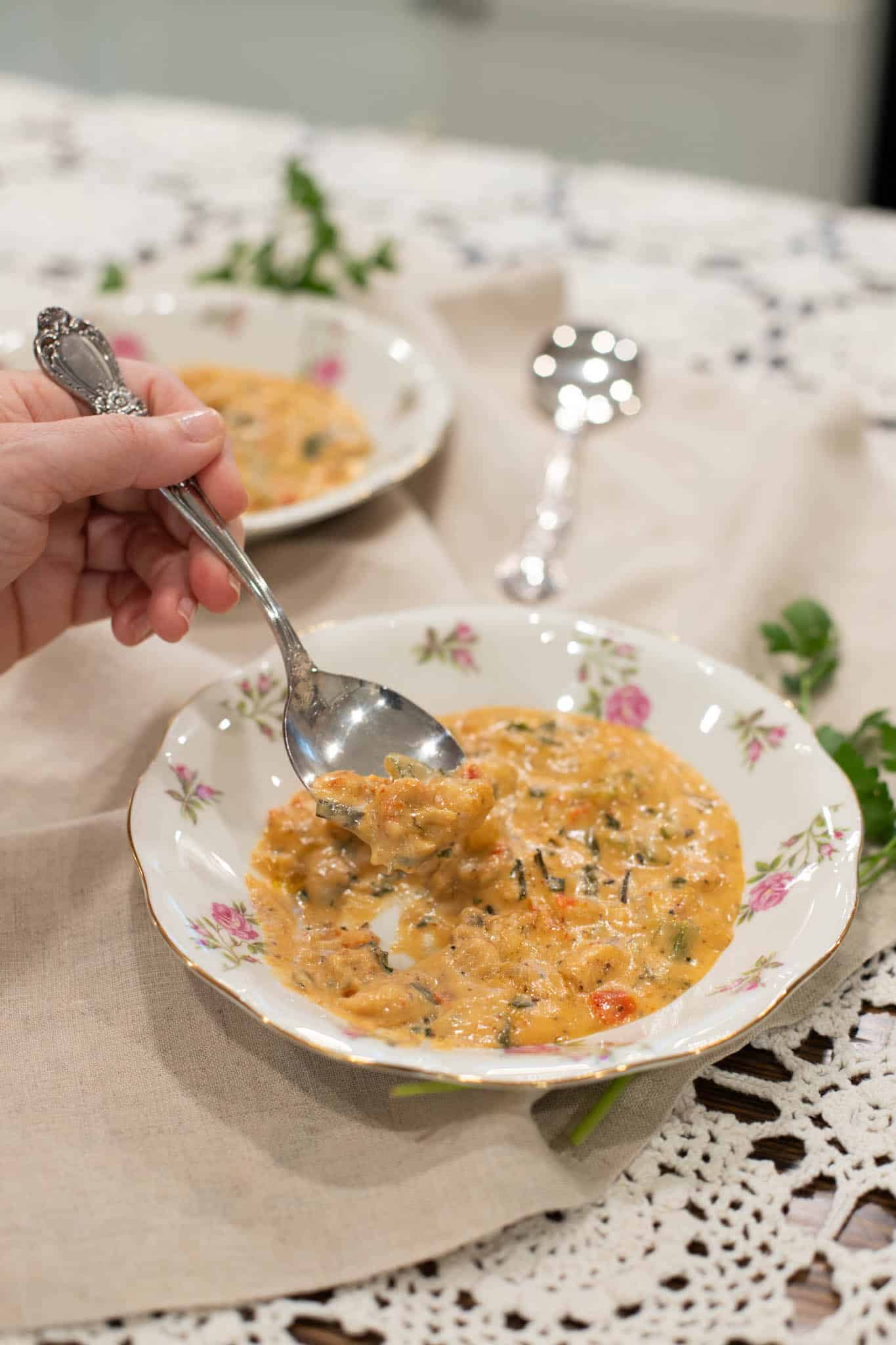 Melted butter, a rich roux, and a touch of heavy cream create a creamy sauce that clings to every bite. The addition of green bell pepper, bay leaf, Worcestershire sauce, and lemon juice builds layers of flavor that develop as it simmers.