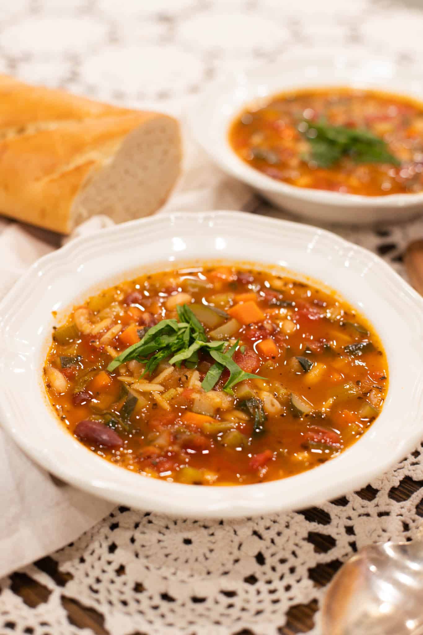 Two bowls of hearty minestrone soup served with a crusty baguette on the side, garnished with fresh basil and Parmesan cheese for a cozy presentation.